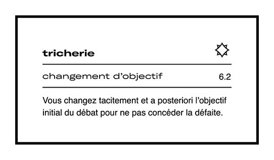 Set of 84 cards. The aim is to cover the families of fallacious arguments, learn to recognize them and place them in the taxonomy.